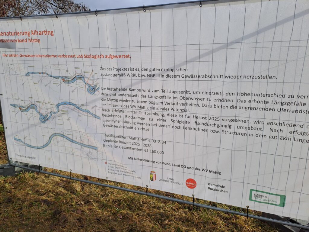Die Mattig wird im Bereich Allharting renaturiert. Eine Rampe wird abgesenkt und verschiedene Maßnahmen zur Dynamisierung des Gewässers-wie Buhneneinbauten und dgl.-werden durchgeführt, sodaß über eine schnellere Fließgeschwindigkeit eine Dynamisierung erfolgt. Hier eine Übersicht: