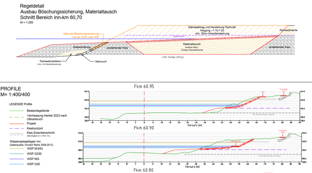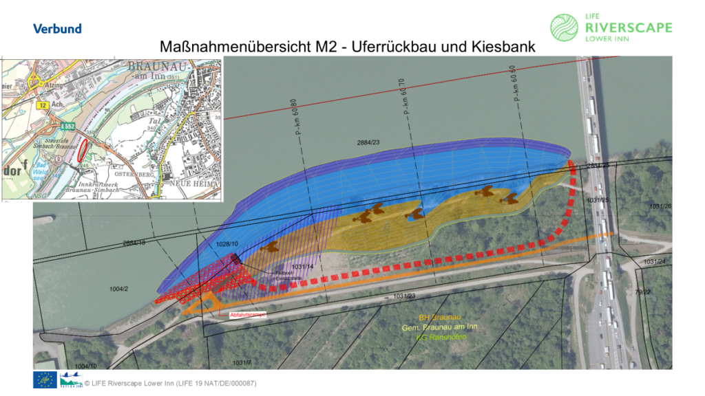 Im Bereich Kraftwerk Braunau – Simbach bis zur neuen Straßenbrücke wird die Uferlinie aufgebrochen und Kies eingebracht sodass eine (Teil)-überflutete Schotterbank entsteht. Für Kieslaicher und auch für die Fischerei wird sich hier einiges verbessern. Hier ein paar Folien aus dem Projektentwurf: